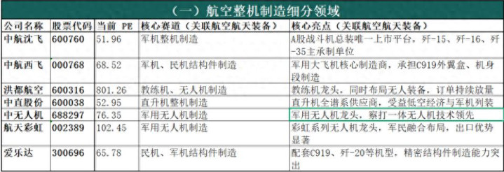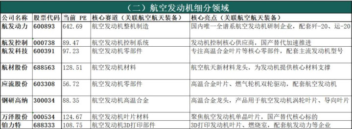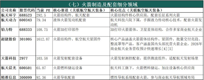 说明:1.上市公司统计以A股为主,优先筛选主营业务明确关联航空航天装备领域的企业,尽可能覆盖核心标的;2. 当前PE(市盈率TTM)数据来源于同花顺金融数据库,截至2026年3月10日,负PE标注为负数,数据仅供参考,随市场波动变化;3. 核心赛道、核心亮点均聚焦航空航天相关业务,描述力求简洁精准。