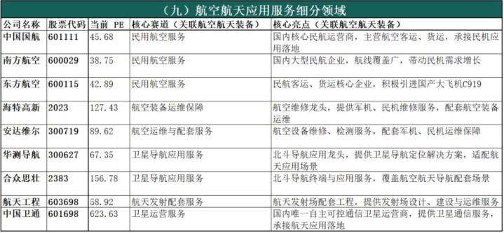 核心业务:承接中游航空航天装备落地,涵盖国防应用配套、民用航空服务、商业航天服务、装备运维保障、卫星应用服务等,是产业链需求端的核心载体,直接驱动中游产能释放。